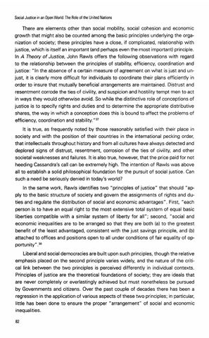 There are elements other than social mobility, social cohesion and economic growth that might also be counted among the basic principles underlying the organization of society; these principles have a close, if complicated, relationship with justice, which is itself an important (and perhaps even the most important) principle. In A Theory of Justice, John Rawls offers the following observations with regard to the relationship between the principles of stability, efficiency, coordination and justice: "In the absence of a certain measure of agreement on what is just and unjust, it is clearly more difficult for individuals to coordinate their plans efficiently in order to insure that mutually beneficial arrangements are maintained. Distrust and resentment corrode the ties of civility, and suspicion and hostility tempt men to act in ways they would otherwise avoid. So while the distinctive role of conceptions of justice is to specify rights and duties and to determine the appropriate distributive shares, the way in which a conception does this is bound to affect the problems of efficiency, coordination and stability. "37 It is true, as frequently noted by those reasonably satisfied with their place in society and with the position of their countries in the international pecking order, that intellectuals throughout history and from all cultures have always detected and deplored signs of distrust, resentment, corrosion of the ties of civility, and other societal weaknesses and failures. It is also true, however, that the price paid for not heeding Cassandra's call can be extremely high. The intention of Rawls was above all to establish a solid philosophical foundation for the pursuit of social justice. Can such a need be seriously denied in today's world? In the same work, Rawls identifies two "principles of justice" that should "apply to the basic structure of society and govern the assignments of rights and duties and regulate the distribution of social and economic advantages". First, "each person is to have an equal right to the most extensive total system of equal basic liberties compatible with a similar system of liberty for all"; second, "social and economic inequalities are to be arranged so that they are both (a) to the greatest benefit of the least advantaged, consistent with the just savings principle, and (b) attached to offices and positions open to all under conditions of fair equality of opportunity" .38 Liberal and social democracies are built upon such principles, though the relative emphasis placed on the second principle varies widely, and the nature of the critical link between the two principles is perceived differently in individual contexts. Principles of justice are the theoretical foundations of society; they are ideals that are never completely or everlastingly achieved but must nonetheless be pursued by Governments and citizens. Over the past couple of decades there has been a regression in the application of various aspects of these two principles; in particular, little has been done to ensure the proper "arrangement" of social and economic inequalities.