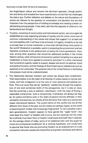 the Anglo-Saxon culture and remains the dominant approach, though positivism and divine and revealed law have experienced a revival that has challenged the status quo. Further reflection and debate on the nature and foundations of justice are relevant to the question of universalism and pluralism but are also important from the perspective of building knowledge and creating a better understanding among people. It has been said that the opposite of violence is not benevolence but thought. If justice, consisting of social justice and international justice, can once again be established as a key organizing principle of society and the world, some sort of common understanding of the values and virtues that support it or at least are not incompatible with it will have to be achieved. Is frugality, simplicity or (to use a concept dear to Hume) moderation a virtue that will help bring more justice to the world? Moderation is probably useful in protecting the environment and can therefore contribute to the achievement of justice for future generations. However, among other questions that should be addressed candidly in the United Nations setting, what will become of economic justice if simplicity is a value and moderation a moral norm applied to economic activities? It is often maintained that humankind urgently needs to expand, deepen and enrich its spiritual, moral and political horizons, and the findings of this limited inquiry indicate that such an assertion is not unfounded. The potential role of the United Nations in facilitating this process must not be underestimated. The relationship between freedom and justice has always been problematic. Their reconciliation is at the heart of all theories of justice based on secular premises, and their antagonism is at the core of most personal and political conflicts. This is an issue that can be "perfectly" settled only through the suppression of one (and sometimes both) of the protagonists, but it is also an issue that the world has a duty to address-relentlessly-with the hope of finding a reasonable compromise. Such a compromise, if achieved, will always be fragile, for justice and liberty exist in the realm of passion and are affected, in their conception and exercise, by virtually all the elements that make up a society and shape international relations. The current terms of this conflict are not all that different from those of the past, but the stakes are perhaps higher, as the world is becoming both smaller and increasingly fragmented. To risk a possibly imprudent generalization, freedom appears to have gained the "upper handnubut what does this mean? Is freedom still a luxury, and are injustices still the cross the multitude must bear? How is freedom understood and lived? Has it retained, for the average citizen of today, some of its traditional links with the quest for moral and professional excellence? As a working hypothesis, one would have to assume that those who are promoting freedom as an endorsement af crude competition between perpetually dissatisfied and greedy individuals and nations