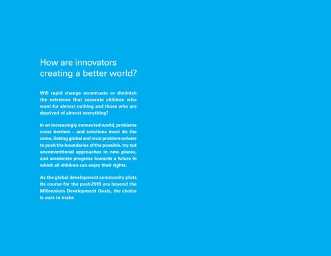 How are innovators creating a better world? Will rapid change accentuate or diminish the extremes that separate children who want for almost nothing and those who are deprived of almost everything? In an increasingly connected world, problems cross borders – and solutions must do the same, linking global and local problem solvers to push the boundaries of the possible, try out unconventional approaches in new places, and accelerate progress towards a future in which all children can enjoy their rights. As the global development community plots its course for the post-2015 era beyond the Millennium Development Goals, the choice is ours to make.