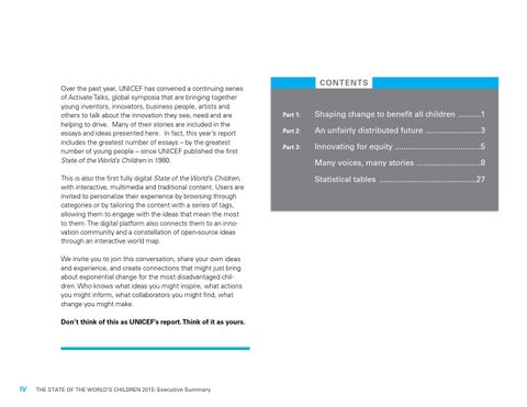Over the past year, UNICEF has convened a continuing series of Activate Talks, global symposia that are bringing together young inventors, innovators, business people, artists and others to talk about the innovation they see, need and are helping to drive. Many of their stories are included in the essays and ideas presented here. In fact, this year’s report includes the greatest number of essays – by the greatest number of young people – since UNICEF published the first State of the World’s Children in 1980. This is also the first fully digital State of the World’s Children, with interactive, multimedia and traditional content. Users are invited to personalize their experience by browsing through categories or by tailoring the content with a series of tags, allowing them to engage with the ideas that mean the most to them. The digital platform also connects them to an innovation community and a constellation of open-source ideas through an interactive world map. We invite you to join this conversation, share your own ideas and experience, and create connections that might just bring about exponential change for the most disadvantaged children. Who knows what ideas you might inspire, what actions you might inform, what collaborators you might find, what change you might make. Don’t think of this as UNICEF’s report. Think of it as yours.