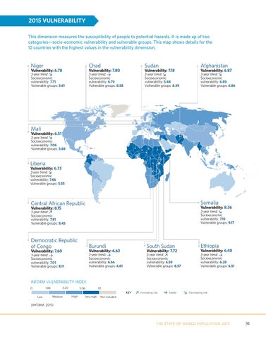2015 VULNERABILITY This dimension measures the susceptibility of people to potential hazards. It is made up of two categories—socio-economic vulnerability and vulnerable groups. This map shows details for the 12 countries with the highest values in the vulnerability dimension.