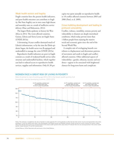 Fragile countries have the poorest health indicators, and poor health outcomes can contribute to fragility. But State fragility can in turn cause high disease and mortality rates as a result of ineffective service delivery (Haar and Rubenstein, 2012). The largest Ebola epidemic in history hit West Africa in 2014. The worst-affected countries, Guinea, Liberia and Sierra Leone are fragile States (UNDP, 2015a). A devastating 14-year conflict destroyed much of Liberia’s infrastructure, so by the time the Ebola epidemic began, the health sector was ill-equipped and understaffed to manage the crisis (UNDP, 2015a). Reproductive health indicators are poor in fragile contexts as a result of weakened health service infrastructure and understaffed facilities, which together can lead to reduced access to reproductive health services, supplies and information. Only $1.30 per