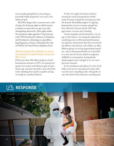 To date, the supply of assistance aimed at meeting the sexual and reproductive health needs of women and girls has not kept pace with the demand. Remarkable progress in targeting humanitarian services to women and girls has been achieved in the past decade. Still, large gaps remain, in action and in funding. Gender inequality and discrimination—by sex, age or other factors—are among the explanations, manifesting even in well-intentioned humanitarian responses. Interventions that fail to account for the different ways disasters and conflicts can affect different groups can end up perpetuating inequalities, such as when general health care is provided in a crisis, but not services related to pregnancy, childbirth or contraception, leaving alreadydisadvantaged women and girls in an even more precarious situation. In the tumultuous early phase of a crisis, food, shelter and care for acute physical trauma often seem the most compelling needs, with gender or any other kind of discrimination something that