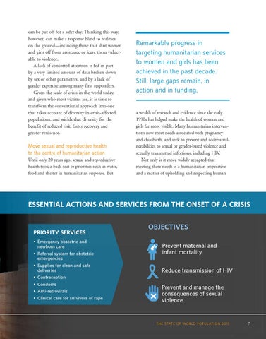 can be put off for a safer day. Thinking this way, however, can make a response blind to realities on the ground—including those that shut women and girls off from assistance or leave them vulnerable to violence. A lack of concerted attention is fed in part by a very limited amount of data broken down by sex or other parameters, and by a lack of gender expertise among many first responders. Given the scale of crisis in the world today, and given who most victims are, it is time to transform the conventional approach into one that takes account of diversity in crisis-affected populations, and wields that diversity for the benefit of reduced risk, faster recovery and greater resilience. Move sexual and reproductive health to the centre of humanitarian action
