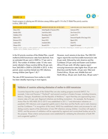 In the 22 priority countries of the Global Plan, overall mother-to-child transmission rates have declined, from an estimated 26 per cent in 2009 to 17 per cent in 2012. The number of children under 15 who were newly infected in these countries fell by 36 per cent, from 360,000 in 2009 to 230,000 in 2012. In this period, seven countries halved new HIV infections among children (see Figure 1.4).33