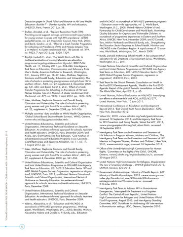 United Nations Educational, Scientific and Cultural Organization and Joint United Nations Programme on HIV/AIDS Inter-Agency Task Team on Education, 2011–2012 Education Sector HIV and AIDS Global Progress Survey: Progression, regression or stagnation?, UNESCO, Paris, 2013; and United Nations Educational, Scientific and Cultural Organization, International Technical Guidance on Sexuality Education: An evidence-informed approach for schools, teachers and health educators, UNESCO, Paris, December 2009.