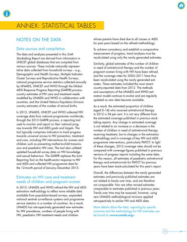 The data and analyses presented in this Sixth Stocktaking Report are derived from information in UNICEF global databases that are compiled from various sources. These include nationally representative data collected from household surveys – e.g., Demographic and Health Surveys, Multiple Indicator Cluster Surveys and Reproductive Health Surveys; national programme service statistics collected annually by UNAIDS, UNICEF and WHO through the Global AIDS Response Progress Reporting (GARPR) process: country estimates of HIV care and treatment needs modelled by UNAIDS and WHO in collaboration with countries; and the United Nations Population Division country estimates of the number of annual births. In 2013, UNAIDS, UNICEF and WHO collected HIV coverage data from national programmes worldwide, through the 2013 GARPR process, a reporting tool used to monitor and report on their national progress towards HIV and AIDS goals and targets. The tool typically comprises indicators to track progress towards universal access to HIV prevention, treatment and care, including HIV interventions for women and children such as preventing mother-to-child transmission and paediatric HIV care. The tool also collated updated household survey data on HIV knowledge and sexual behaviour. The GARPR replaces the Joint Reporting Tool on the health-sector response to HIV and AIDS and collected HIV programme data for the 12-month period of January–December 2013.