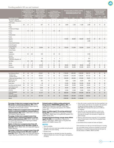 Percentage of infants born to pregnant women living with HIV started on cotrimoxazole prophylaxis, 2012: UNAIDS, UNICEF, WHO, 2013 Global AIDS Response Progress Reporting and UNAIDS 2012 HIV and AIDS estimates. Number of infants born to pregnant women living with HIV started on antiretroviral prophylaxis to prevent mother-tochild transmission, 2012: UNAIDS, UNICEF, WHO, 2013 Global AIDS Response Progress Reporting. Percentage of infants born to pregnant women living with HIV started on antiretroviral prophylaxis to prevent mother-to-child transmission, 2012: UNAIDS, UNICEF, WHO, 2013 Global AIDS Response Progress Reporting and UNAIDS 2012 HIV and AIDS estimates. Number of infants born to pregnant women living with HIV receiving virological test for HIV within 2 months of birth, 2012: UNAIDS, UNICEF, WHO, 2013 Global AIDS Response Progress Reporting. Percentage of infants born to pregnant women living with HIV receiving virological test for HIV within 2 months of birth, 2012: UNAIDS, UNICEF, WHO, 2013 Global AIDS Response Progress Reporting, and UNAIDS 2012 HIV and AIDS estimates.
