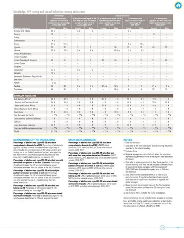 – Data not available. * Data refer to the most recent year available during the period specified in the column heading. ** Excludes China. ǂ Regional averages are calculated only when the population represents 50 per cent or more of the region’s total population of interest. x Data refer to years or periods other than those specified in the column heading. Such data are not included in the calculation of regional and global averages, with the exception of 2005–2006 India. Estimates from years prior to 2005 are not displayed. y Data differ from the standard definition or refer to only part of a country. If they fall within the reference period, such data are included in the calculation of regional and global averages. p Based on small denominators (typically 25–29 unweighted cases). No data based on fewer than 25 unweighted cases are displayed. a/ Sub-Saharan Africa includes the Sudan and Djibouti. Some estimates do not add up to the totals because of rounding. Low- and middle-income countries are classified as such by the World Bank as of July 2013; these countries form the basis for the data analysis in UNAIDS, UNICEF and WHO.