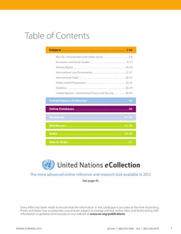 Table of Contents Subjects . . . . . . . . . . . . . . . . . . . . . . . . . . . . . . . . . . . . . . . . . . . 2-44 Rio+20 / Environment and Urban Issues . . . . . . . . . . . . . . . . . . . . 2-8 Economic and Social Studies . . . . . . . . . . . . . . . . . . . . . . . . . . . . . . 9-17 Human Rights . . . . . . . . . . . . . . . . . . . . . . . . . . . . . . . . . . . . . . . . . . . . 18-20 International Law/Governance. . . . . . . . . . . . . . . . . . . . . . . . . . . . 21-27 International Trade . . . . . . . . . . . . . . . . . . . . . . . . . . . . . . . . . . . . . . . 28-32 Public Health/Population . . . . . . . . . . . . . . . . . . . . . . . . . . . . . . . . . 33-35 Statistics . . . . . . . . . . . . . . . . . . . . . . . . . . . . . . . . . . . . . . . . . . . . . . . . . 36-39 United Nations / International Peace and Securiy . . . . . . . . . . 40-44