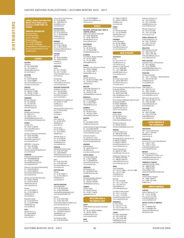 EUROPE AUSTRIA LexisNexis Tel. +43 (1) 534525555 Fax. +43 (1) 53452141 bestellung@lexisnexis.at www.lexisnexis.at BELGIUM DL Services Tel. +32 (0) 25384308 Fax. +32 (0) 25380841 jean.de.lannoy@dl-servi.com www.jean-de-lannoy.be/ CROATIA Roberts Plus Doo Tel. +385 (0) 21315800 Fax. +385 (0) 21315804 robertsplus@robertsplus.hr DENMARK Bierman & Bierman Tel. +45 75320288 Fax. +45 75321548 mail@bierman.co.uk www.biermanaps.dk FINLAND Akateeminen Kirjakauppa Tel. +358 912141 Fax. +358 91214441 tiedustelut@akateeminen.com www.akateeminenkirjakauppa.com FRANCE Lavoisier SAS Tel. +33 (0) 147406700 service.client@lavoisier.fr www.lavoisier.fr Librairie du Commerce International Tel. +33 (0) 140733460 Fax. +33 (0) 140733898 librairie@businessfrance.fr www.businessfrance.fr UBIFRANCE - Librairie du Tel. + (33) 1 40733460 Fax. + (33) 1 40733898 francoise.scheydecker@ubifrance.fr www.ubifrance.fr GERMANY Hugendubel Fachinformationen Tel. +49 (0) 80002832437 Fax. +49 (0) 6151386266 darmstadt@hugendubel.info www.hugendubel.info Massmann International Buchhandlung Tel. +49 (0) 4076700418 Fax. +49 (0) 476700410 kay.massmann@massmann.de www.massmann.de Missing Link Versandbuchhandlung Tel. +49 (0) 421504348 Fax. +49 (0) 421504316 info@missing-link.de www.missing-link.de Planetis Tel. +41 (0) 223665177 Fax. +41 (0) 223665178 info@planetis.ch www.planetis.ch Roodveldt Publidis Tel. +31 (0) 204973779 Fax. +31 (0) 204970096 info@publidis.org www.publidis.org ITALY Casalini Libri s.p.a. Tel. +39 (0) 5550181 orders@casalini.it www.casalini.it