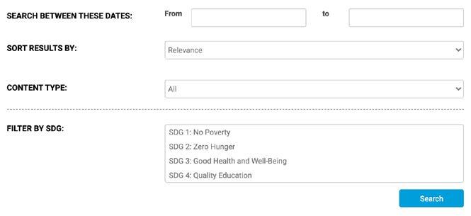 Get precise results within seconds by using one or more search criteria and applying filters by date, content type, and SDG.