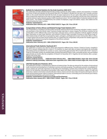 This publication is issued in two volumes which were prepared at different times. Volume I: Trade by Country, compiled in May 2012, presents detailed data for a total of 174 countries (or areas) with data on imports and exports by commodity and trading partner provided for 93 countries (or areas), representing approximately 79% of world trade of 2011. Volume II: Trade by Commodity contains the detailed tables showing international trade in main commodity groups, and was finalized approximately six months after the completion of Volume I (in November 2011). Together, the two volumes offer a comprehensive view of the topic. Publisher: United Nations Volume I: Trade by Country Publication Date: February 2013 ISBN: 9789211615616 Pages: 424 Price: $115.00 Volume II: Trade by Commodity Publication Date: September 2013 ISBN: 9789211615654 Pages: 450 Price: $115.00
