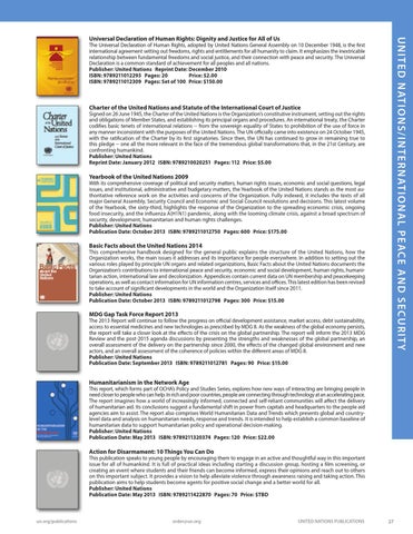 The Universal Declaration of Human Rights, adopted by United Nations General Assembly on 10 December 1948, is the first international agreement setting out freedoms, rights and entitlements for all humanity to claim. It emphasizes the inextricable relationship between fundamental freedoms and social justice, and their connection with peace and security. The Universal Declaration is a common standard of achievement for all peoples and all nations. Publisher: United Nations Reprint Date: December 2010 ISBN: 9789211012293 Pages: 20 Price: $2.00 ISBN: 9789211012309 Pages: Set of 100 Price: $150.00