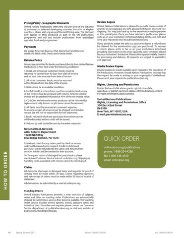Claims All claims for shortages or damaged items and requests for proof of delivery must be made within 30 days. Claims regarding payments and non-receipt of orders must be made within 30 days of receipt of statement. All claims must be submitted by e-mail at order@un.org Standing Orders United Nations Publications provides a wide selection of subjects, series and titles on standing order. Publications are automatically shipped to customers as soon as they become available. The Standing Order service includes several options: overall, category, series and individual titles. For orders and inquiries please contact our Customer Service department at publications@un.org or visit our website at publications/standingorder.aspx.