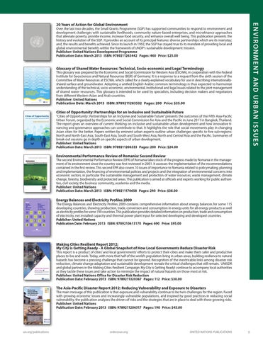 “Cities of Opportunity: Partnerships for an Inclusive and Sustainable Future” presents the outcomes of the Fifth Asia-Pacific Urban Forum, organized by the Economic and Social Commission for Asia and the Pacific in June 2011 in Bangkok, Thailand. The report gives an overview of current thinking on inclusive and sustainable urban development and how innovative financing and governance approaches can contribute to that. It highlights the role that social movements play in changing Asian cities for the better. Papers written by eminent urban experts outline urban challenges specific to five sub-regions: North and North-East Asia, South-East Asia, South and South-West Asia, North and Central Asia and the Pacific. Summaries of break-out sessions go in depth on specific aspects of urban development. Publisher: United Nations Publication Date: March 2013 ISBN: 9789211206333 Pages: 200 Price: $24.00