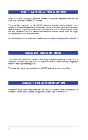 ABOUT UNECE COUNTRIES IN FIGURES UNECE Countries in Figures presents profiles of social and economic indicators for each of the 56 UNECE member countries. These profiles, prepared by the UNECE Statistical Division, are intended to be of interest to readers not necessarily familiar with statistical terminology or with interpreting statistical tables. A glossary of terms is available at the back of the publication. Users are also advised to consult the explanatory notes for specific details about the origins and applicability of the indicators used. An online version of this publication can be found at: unece.org/statistics/profiles2015