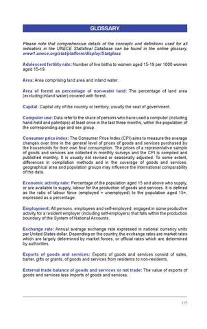 GLOSSARY Please note that comprehensive details of the concepts and definitions used for all indicators in the UNECE Statistical Database can be found in the online glossary, www1.unece.org/stat/platform/display/Statgloss Adolescent fertility rate: Number of live births to women aged 15-19 per 1000 women aged 15-19. Area: Area comprising land area and inland water. Area of forest as percentage of non-water land: The percentage of land area (excluding inland water) covered with forest. Capital: Capital city of the country or territory, usually the seat of government. Computer use: Data refer to the share of persons who have used a computer (including hand-held and palmtops) at least once in the last three months, within the population of the corresponding age and sex group. Consumer price index: The Consumer Price Index (CPI) aims to measure the average changes over time in the general level of prices of goods and services purchased by the households for their own final consumption. The prices of a representative sample of goods and services are collected in monthly surveys and the CPI is compiled and published monthly. It is usually not revised or seasonally adjusted. To some extent, differences in compilation methods and in the coverage of goods and services, geographical area and population groups may influence the international comparability of the data. Economic activity rate: Percentage of the population aged 15 and above who supply, or are available to supply, labour for the production of goods and services. It is defined as the ratio of labour force (employed + unemployed) to the population aged 15+, expressed as a percentage. Employment: All persons, employees and self-employed, engaged in some productive activity for a resident employer (including self-employers) that falls within the production boundary of the System of National Accounts. Exchange rate: Annual average exchange rate expressed in national currency units per United States dollar. Depending on the country, the exchange rates are market rates which are largely determined by market forces, or official rates which are determined by authorities. Exports of goods and services: Exports of goods and services consist of sales, barter, gifts or grants, of goods and services from residents to non-residents. External trade balance of goods and services or net trade: The value of exports of goods and services less imports of goods and services.