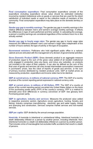 Final consumption expenditure: Final consumption expenditure consists of the expenditure (including expenditure whose value should be estimated indirectly) incurred by resident institutional units on goods or services that are used for the direct satisfaction of individual needs or wants or the collective needs of members of the community. Final consumption expenditure may take place on the domestic territory or abroad. Gender pay gap in monthly earnings: The gender pay gap in monthly earnings is the relative difference between men’s and women’s average monthly earnings. It reflects the differences in type of work performed and time worked. In calculating the average, a person’s monthly earnings are considered regardless of the numbers hours he or she actually worked. Gender pay gap in hourly wage rates: The gender pay gap in hourly wage rates measures the difference between men’s and women’s wage rates independent of the number of hours worked, the type of activity or the type of occupation. Government ministers: Politicians who hold significant public office in a national cabinet and are entrusted with the management of a division of governmental activities. Gross Domestic Product (GDP): Gross domestic product is an aggregate measure of production equal to the sum of the gross value added of all resident institutional units engaged in production (plus any taxes, and minus any subsidies, on products not included in the value of their outputs). It can also be defined as the sum of the final uses of goods and services (all uses except intermediate consumption) measured in purchasers’ prices, less the value of imports of goods and services, or the sum of primary incomes distributed by resident producer units. GDP at market prices as measured by production, expenditure and income sides has to be identical. GDP at current prices, in millions of national currency, PPP: The GDP of a country at prices of the current reporting period expressed in national currency units. GDP at current prices, in millions of US Dollars, PPP: The GDP of a country at prices of the current reporting period converted into United States dollars on the basis of the purchasing power parity (PPP) of the country’s currency. PPP is a method to eliminate price level differences in currency conversion of GDP. See glossary term Purchasing power parity. GDP in agriculture, industry and services: Measures the produced value added in respective economic sectors. Agriculture covers agriculture, hunting, forestry and fishing; Industry comprises manufacturing, electricity, gas and water supply, mining and quarrying and construction; Services comprise market services and non-market services. GDP per capita: GDP divided by the annual average population. Homicide: A homicide is intentional or unintentional killing. Intentional homicide is a death deliberately inflicted on a person by another person, including infanticide. Nonintentional homicide is a death not deliberately inflicted on a person by another person. That includes crime of manslaughter but excludes traffic accidents that result in a death of persons.
