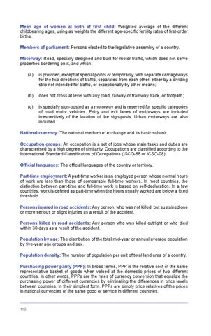 National currency: The national medium of exchange and its basic subunit. Occupation groups: An occupation is a set of jobs whose main tasks and duties are characterised by a high degree of similarity. Occupations are classified according to the International Standard Classification of Occupations (ISCO-88 or ICSO-08). Official languages: The official languages of the country or territory. Part-time employment: A part-time worker is an employed person whose normal hours of work are less than those of comparable full-time workers. In most countries, the distinction between part-time and full-time work is based on self-declaration. In a few countries, work is defined as part-time when the hours usually worked are below a fixed threshold. Persons injured in road accidents: Any person, who was not killed, but sustained one or more serious or slight injuries as a result of the accident. Persons killed in road accidents: Any person who was killed outright or who died within 30 days as a result of the accident. Population by age: The distribution of the total mid-year or annual average population by five-year age groups and sex. Population density: The number of population per unit of total land area of a country. Purchasing power parity (PPP): In broad terms, PPP is the relative cost of the same representative basket of goods when valued at the domestic prices of two different countries. In other words, PPPs are the rates of currency conversion that equalize the purchasing power of different currencies by eliminating the differences in price levels between countries. In their simplest form, PPPs are simply price relatives of the prices in national currencies of the same good or service in different countries.