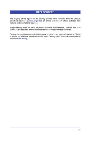 DATA SOURCES The majority of the figures in the country profiles were extracted from the UNECE Statistical Database (unece.org/data), an online collection of official statistics from national and international sources. Supplementary data for small countries (Andorra, Liechtenstein, Monaco and San Marino) were obtained directly from the statistical offices of these countries. Data on the population of capital cities were obtained from National Statistical Offices or, where not available, from the United Nations Demographic Yearbook (data available online at data.un.org).