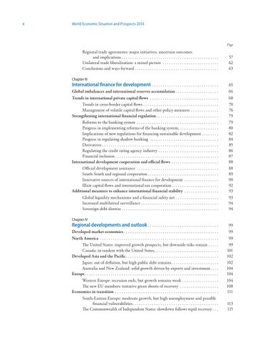 Regional developments and outlook. . . . . . . . . . . . . . . . . . . . . . . . . . . . . . . . . . 99 Developed market economies. . . . . . . . . . . . . . . . . . . . . . . . . . . . . . . . . . . . . . . . . . . . . 99 North America . . . . . . . . . . . . . . . . . . . . . . . . . . . . . . . . . . . . . . . . . . . . . . . . . . . . . . . . 99 The United States: improved growth prospects, but downside risks remain. . . . . . 99 Canada: in tandem with the United States. . . . . . . . . . . . . . . . . . . . . . . . . . . . . . . 101 Developed Asia and the Pacific. . . . . . . . . . . . . . . . . . . . . . . . . . . . . . . . . . . . . . . . . . . . 102 Japan: out of deflation, but high public debt remains. . . . . . . . . . . . . . . . . . . . . . . 102 Australia and New Zealand: solid growth driven by exports and investment. . . . . 104 Europe. . . . . . . . . . . . . . . . . . . . . . . . . . . . . . . . . . . . . . . . . . . . . . . . . . . . . . . . . . . . . . . 104 Western Europe: recession ends, but growth remains weak. . . . . . . . . . . . . . . . . . 104 The new EU members: tentative green shoots of recovery . . . . . . . . . . . . . . . . . . . 108 Economies in transition . . . . . . . . . . . . . . . . . . . . . . . . . . . . . . . . . . . . . . . . . . . . . . . . . 111 South-Eastern Europe: moderate growth, but high unemployment and possible financial vulnerabilities. . . . . . . . . . . . . . . . . . . . . . . . . . . . . . . . . . . . . . . . . 113 The Commonwealth of Independent States: slowdown follows tepid recovery. . . . 115