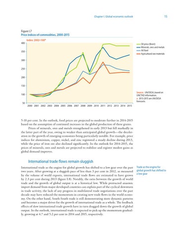 International trade flows remain sluggish International trade as the engine for global growth has shifted to a low gear over the past two years. After growing at a sluggish pace of less than 3 per cent in 2012, as measured by the volume of world exports, international trade flows are estimated to have grown by 2.3 per cent during 2013 (figure I.8). Notably, the ratio between the growth of world trade and the growth of global output is at a historical low. While protracted anaemic import demand from major developed countries can explain part of the cyclical downturn in trade activity, the lack of any progress in multilateral trade negotiations over the past decade may have reduced the momentum in creating new trade flows in the world economy. On the other hand, South-South trade is still demonstrating more dynamic patterns and becomes a major driver for the growth of international trade as a whole. The feedback effects of slow international trade growth have in turn dragged down the growth of global output. In the outlook, international trade is expected to pick up the momentum gradually, growing at 4.7 and 5.2 per cent in 2014 and 2015, respectively.