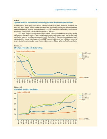 Box I.3 Spillover effects of unconventional monetary policies in major developed countriesa In the aftermath of the global financial crisis, the central banks of the major developed economies lowered their policy interest rates to close to zero, while also aggressively pursuing unconventional monetary policy measures, including quantitative easing (QE)—an expansion of the monetary bases through purchasing and holding of long-term assets (figures I.3.1 and I.3.2). As a result, developing countries and economies in transition have experienced waves of capital flows over the past few years. These capital flows have directly impacted equity and bond prices in developing countries as well as exchange rates, while also indirectly affecting other variables in developing countries, such as monetary growth, real GDP, exports and imports, and inflation. A number of recent studies have attempted to assess the size and importance of these spillover effects for developing