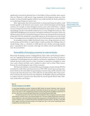 significantly increased the potential losses to the holders of those portfolios when interest rates rise. Moreover, as QE moved a large proportion of the long-term bonds out of the markets, it reduced market liquidity, which in turn could intensify the shocks and lead to an overshooting of long-term interest rates. More importantly, those first-round shocks in international financial markets could transmit quickly to the domestic real economic sectors of both developed and developing countries. For example, in major developed countries, such as the United States, a marked increase in long-term interest rates would be detrimental not only to banks, in terms of funding challenges, but also to households and businesses, in terms of higher financial costs. This could stifle the fledgling recovery in private consumption and business investment. In fact, the 100-basis-point increase in benchmark long-term interest rates during the financial turmoil of May-June 2013 has already left a measurable imprint on the housing sector in the United States. As mortgage interest rates spiked, the recovery in the housing sector weakened notably. In emerging economies, higher benchmark interest rates, rising risk premia on external financing, and the decline in capital inflows would exacerbate the challenges they are already facing—that is, a slowdown in GDP growth and a further narrowing of policy space—especially for those economies with large twin deficits and elevated inflation (see more discussion below).