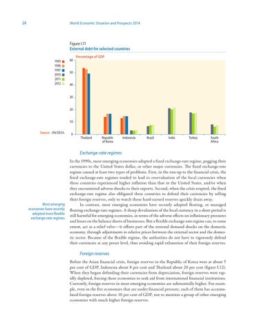 Foreign reserves Before the Asian financial crisis, foreign reserves in the Republic of Korea were at about 5 per cent of GDP, Indonesia about 8 per cent and Thailand about 20 per cent (figure I.12). When they began defending their currencies from depreciation, foreign reserves were rapidly depleted, forcing these economies to seek aid from international financial institutions. Currently, foreign reserves in most emerging economies are substantially higher. For example, even in the five economies that are under financial pressure, each of them has accumulated foreign reserves above 10 per cent of GDP, not to mention a group of other emerging economies with much higher foreign reserves.