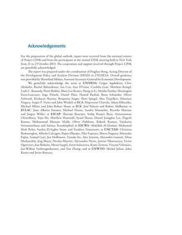 Acknowledgements For the preparation of the global outlook, inputs were received from the national centres of Project LINK and from the participants at the annual LINK meeting held in New York from 21 to 23 October 2013. The cooperation and support received through Project LINK are gratefully acknowledged. The report was prepared under the coordination of Pingfan Hong, Acting Director of the Development Policy and Analysis Division (DPAD) in UN/DESA. Overall guidance was provided by Shamshad Akhtar, Assistant Secretary-General for Economic Development. We gratefully acknowledge the team at UN/DESA: Grigor Agabekian, Clive Altshuler, Rachel Babruskinas, Ian Cox, Ann D’Lima, Cordelia Gow, Matthias Kempf, Leah C. Kennedy, Pierre Kohler, Mary Lee Kortes, Hung-yi Li, Nitisha Pandey, Mariangela Parra-Lancourt, Ingo Pitterle, Daniel Platz, Hamid Rashid, Benu Schneider, Oliver Schwank, Krishnan Sharma, Benjamin Singer, Shari Spiegel, Alex Trepelkov, Sebastian Vergara, Sergio P. Vieira and John Winkel; at ECA: Hopestone Chavula, Adam Elhiraika, Michael Mbate and John Robert Sloan; at ECE: José Palacín and Robert Shelburne; at ECLAC: Juan Alberto Fuentes, Michael Hanni, Sandra Manuelito, Ricardo Martner and Jurgen Weller; at ESCAP: Shuvojit Banerjee, Sudip Ranjan Basu, Anisuzzaman Chowdhury, Yejin Ha, Matthew Hammill, Aynul Hasan, Daniel Jeongdae Lee, Nagesh Kumar, Muhammad Hussain Malik, Oliver Paddison, Rakesh Raman, Vatcharin Sirimaneetham and Sutinee Yeamkitpibul; at ESCWA: Abdallah Al Dardari, Mohamed Hedi Bchir, Sandra El-Saghir Sinno and Yasuhisa Yamamoto; at UNCTAD: Christina Bodouroglou, Alfredo Calcagno, Rajan Dhanjee, Pilar Fajarnes, Marco Fugazza, Masataka Fujita, Samuel Gayi, Jan Hoffmann, Taisuke Ito, Alex Izurieta, Alexandra Laurent, Mina Mashayekhi, Jörg Mayer, Nicolas Maystre, Alessandro Nicita, Janvier Nkurunziza, Victor Ognivtsev, Jose Rubiato, Mesut Saygili, Astrit Sulstarova, Komi Tsowou, Vincent Valentine, Jan-Willem Vanhoogenhuizen, and Yan Zhang; and at UNWTO: Michel Julian, John Kester and Javier Ruescas.