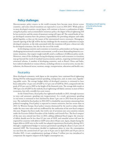 Macroeconomic policy stances in the world economy have become more diverse across countries, and some critical transitions are expected to occur in 2014-2015. While policies in most developed countries, except Japan, will continue to feature a combination of tightening fiscal policy and accommodative monetary policy, the degree of fiscal tightening will be less restrictive and the extent of monetary easing will taper off. The central banks of major developed countries have the primary responsibility for providing adequate and stable global liquidity, as they are the issuers of the international reserve currencies. Managing a smooth tapering of the QE will be the key challenge for the monetary authorities in major developed countries, as the risks associated with this transition will pose a threat not only for developed economies, but also for the rest of the world. In developing countries and economies in transition, policymakers are facing a more challenging international economic environment, as well as more demanding domestic economic situations, that require tough tradeoffs amid a confluence of different policy needs. Moreover, some of the challenges facing developing countries and economies in transition may go beyond the reach of standard macroeconomic policies, requiring institutional and structural reforms. A number of developing countries, such as Brazil, China and India, have indeed embarked on various reforms, including reforms in social security, income distribution, the financial sector, taxation, energy, transportation, education and health care.
