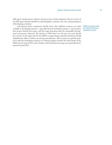 IMF quota and governance reforms, the process has not been finalized. The new review of the IMF quota formula should be resolved quickly to enhance the voice and participation of developing economies. International policy cooperation should ensure that sufficient resources are made available to developing countries—especially the least developed countries—and countries that possess limited fiscal space and face large financing needs for sustainable development and poverty reduction. The decline in ODA flows over the past two years should be reversed. As the target date for the MDGs is approaching, international donors should redouble their efforts to deliver on existing commitments. These resources are greatly needed in order for developing countries to accelerate progress towards the achievement of the MDGs by the end of 2015, and to build a solid foundation for long-run sustainable development beyond 2015.