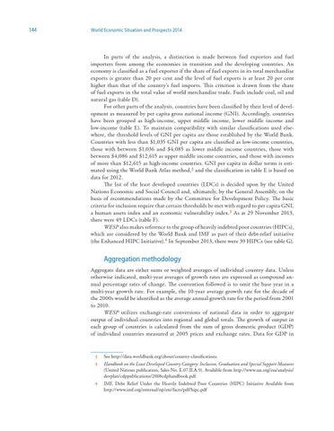 In parts of the analysis, a distinction is made between fuel exporters and fuel importers from among the economies in transition and the developing countries. An economy is classified as a fuel exporter if the share of fuel exports in its total merchandise exports is greater than 20 per cent and the level of fuel exports is at least 20 per cent higher than that of the country’s fuel imports. This criterion is drawn from the share of fuel exports in the total value of world merchandise trade. Fuels include coal, oil and natural gas (table D). For other parts of the analysis, countries have been classified by their level of development as measured by per capita gross national income (GNI). Accordingly, countries have been grouped as high-income, upper middle income, lower middle income and low-income (table E). To maintain compatibility with similar classifications used elsewhere, the threshold levels of GNI per capita are those established by the World Bank. Countries with less than $1,035 GNI per capita are classified as low-income countries, those with between $1,036 and $4,085 as lower middle income countries, those with between $4,086 and $12,615 as upper middle income countries, and those with incomes of more than $12,615 as high-income countries. GNI per capita in dollar terms is estimated using the World Bank Atlas method, 2 and the classification in table E is based on data for 2012. The list of the least developed countries (LDCs) is decided upon by the United Nations Economic and Social Council and, ultimately, by the General Assembly, on the basis of recommendations made by the Committee for Development Policy. The basic criteria for inclusion require that certain thresholds be met with regard to per capita GNI, a human assets index and an economic vulnerability index.3 As at 29 November 2013, there were 49 LDCs (table F). WESP also makes reference to the group of heavily indebted poor countries (HIPCs), which are considered by the World Bank and IMF as part of their debt-relief initiative (the Enhanced HIPC Initiative).4 In September 2013, there were 39 HIPCs (see table G).
