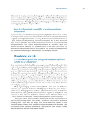 Uncertainties and risks A bumpy exit of quantitative easing measures poses significant risks for the world economy Great uncertainties and risks for global economic growth and the financial stability of the world in the coming years are inextricably associated with the unconventional monetary policies, such as quantitative easing (QE), adopted in major developed countries. Uncertainty and risk come into play particularly when the central banks of these countries start to change their stances on these policies. A bumpy exit from QE could lead to a series of disruptive events, such as: a surge in long-term interest rates, not only in developed economies but also in developing countries; a sell-off in global equity markets; a sharp decline of capital inflows to emerging economies; and a spike in the risk premia for external financing in emerging economies. Those first-round shocks in international financial markets could transmit quickly to the domestic real economic sectors of both developed and developing countries. Many large developing countries, including Brazil, China, India and the Russian Federation, saw a significant deceleration in GDP growth in the past two years, owing to a combination of challenging external conditions and domestic impediments. In the baseline outlook discussed earlier, growth in these economies is expected to strengthen in some cases, such as Brazil, India and the Russian Federation, and to stabilize in others, such as China. Risks remain, however, for a further slowdown for some of these economies. The systemic risks in the euro area have abated significantly, but fragilities remain in both the financial sector and the real economy. Uncertainties associated with the political wrangling in the United States over budget issues and the debt ceiling continue to loom. Moreover, beyond economic risks, geopolitical tensions might spiral out of control. These and other risk factors, unfolding unexpectedly, could derail the world economy far away from the projections outlined in the baseline forecast.