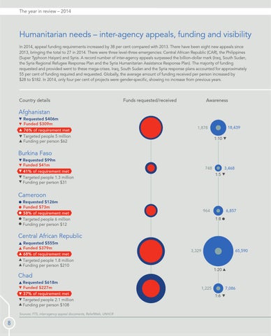 Humanitarian needs – inter-agency appeals, funding and visibility In 2014, appeal funding requirements increased by 38 per cent compared with 2013. There have been eight new appeals since 2013, bringing the total to 27 in 2014. There were three level-three emergencies: Central African Republic (CAR), the Philippines (Super Typhoon Haiyan) and Syria. A record number of inter-agency appeals surpassed the billion-dollar mark (Iraq, South Sudan, the Syria Regional Refugee Response Plan and the Syria Humanitarian Assistance Response Plan). The majority of funding requested and provided went to these mega-crises. Iraq, South Sudan and the Syria response plans accounted for approximately 55 per cent of funding required and requested. Globally, the average amount of funding received per person increased by $28 to $182. In 2014, only four per cent of projects were gender-specific, showing no increase from previous years.
