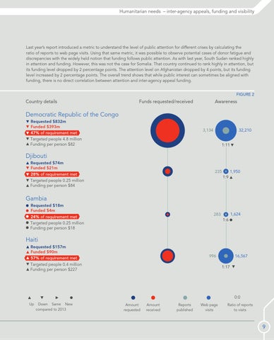 Last year’s report introduced a metric to understand the level of public attention for different crises by calculating the ratio of reports to web page visits. Using that same metric, it was possible to observe potential cases of donor fatigue and discrepancies with the widely held notion that funding follows public attention. As with last year, South Sudan ranked highly in attention and funding. However, this was not the case for Somalia. That country continued to rank highly in attention, but its funding level dropped by 2 percentage points. The attention level on Afghanistan dropped by 4 points, but its funding level increased by 2 percentage points. The overall trend shows that while public interest can sometimes be aligned with funding, there is no direct correlation between attention and inter-agency appeal funding. FIGURE 2