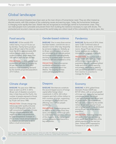 Sources: CRED, DESA, FAO, Global Slavery Index 2014, ILO, IOM, ITU, Millennium Development Goals Progress Report, NRC, Oxfam, UNHCR, UNISDR, UNDP, UNESCO, UNODC, UN Women, USAID, WHO, World Bank