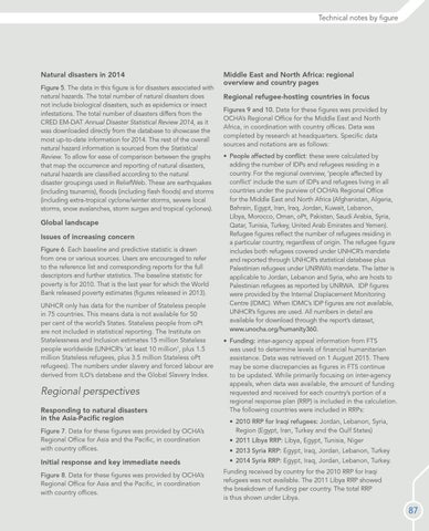 Middle East and North Africa: regional overview and country pages Regional refugee-hosting countries in focus Figures 9 and 10. Data for these figures was provided by OCHA’s Regional Office for the Middle East and North Africa, in coordination with country offices. Data was completed by research at headquarters. Specific data sources and notations are as follows: • People affected by conflict: these were calculated by adding the number of IDPs and refugees residing in a country. For the regional overview, ‘people affected by conflict’ include the sum of IDPs and refugees living in all countries under the purview of OCHA’s Regional Office for the Middle East and North Africa (Afghanistan, Algeria, Bahrain, Egypt, Iran, Iraq, Jordan, Kuwait, Lebanon, Libya, Morocco, Oman, oPt, Pakistan, Saudi Arabia, Syria, Qatar, Tunisia, Turkey, United Arab Emirates and Yemen). Refugee figures reflect the number of refugees residing in a particular country, regardless of origin. The refugee figure includes both refugees covered under UNHCR’s mandate and reported through UNHCR’s statistical database plus Palestinian refugees under UNRWA’s mandate. The latter is applicable to Jordan, Lebanon and Syria, who are hosts to Palestinian refugees as reported by UNRWA. IDP figures were provided by the Internal Displacement Monitoring Centre (IDMC). When IDMC’s IDP figures are not available, UNHCR’s figures are used. All numbers in detail are available for download through the report’s dataset, www.unocha.org/humanity360. • Funding: inter-agency appeal information from FTS was used to determine levels of financial humanitarian assistance. Data was retrieved on 1 August 2015. There may be some discrepancies as figures in FTS continue to be updated. While primarily focusing on inter-agency appeals, when data was available, the amount of funding requested and received for each country’s portion of a regional response plan (RRP) is included in the calculation. The following countries were included in RRPs: • 2010 RRP for Iraqi refugees: Jordan, Lebanon, Syria, Region (Egypt, Iran, Turkey and the Gulf States) • 2011 Libya RRP: Libya, Egypt, Tunisia, Niger • 2013 Syria RRP: Egypt, Iraq, Jordan, Lebanon, Turkey • 2014 Syria RRP: Egypt, Iraq, Jordan, Lebanon, Turkey. Funding received by country for the 2010 RRP for Iraqi refugees was not available. The 2011 Libya RRP showed the breakdown of funding per country. The total RRP is thus shown under Libya.