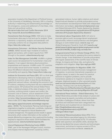 Humanitarian Outcomes – Aid Worker Security Database (AWSD). AWSD records major incidents of violence against aid workers, with incident reports from 1997 through to the present. aidworkersecurity.org/ Index for Risk Management (InforRM). InfoRM is a global, open-source risk assessment for humanitarian crises and disasters. It can support decisions about prevention, preparedness and response. InfoRM covers 191 countries and includes natural and human hazards. It combines about 50 different indicators that measure hazards, vulnerability and capacity. http://www.inform-index.org/ Institute for Economics and Peace (IEP). IEP is a think tank dedicated to developing metrics to analyse peace and quantify its economic value. It does this by developing global and national indices, calculating the economic cost of violence, analysing country-level risk and understanding positive peace. IEP produced the annual Global Peace Index, a statistical analysis of the state of peace in 162 countries, outlining trends in peace and conflict, the economic cost of violence, and an assessment of the attitudes, structures and institutions that sustain peaceful societies. http://economicsandpeace.org/ and Global Peace Index 2015. http://www.visionofhumanity.org/ Inter-agency appeal documents and strategic response plans – OCHA. The Humanitarian Planning Cycle brings aid organizations together to jointly plan, coordinate, implement and monitor their response to natural disasters and complex emergencies. The appeal process results in appeal documents, which contain information on the number of people affected by emergencies, their needs and the funding required to respond to those needs. OCHA facilitates the appeal process. www.humanitarianresponse.info Internal Displacement Monitoring Centre (IDMC). IDMC, part of the Norwegian Refugee Council, monitors and analyses internal displacement caused by conflict,