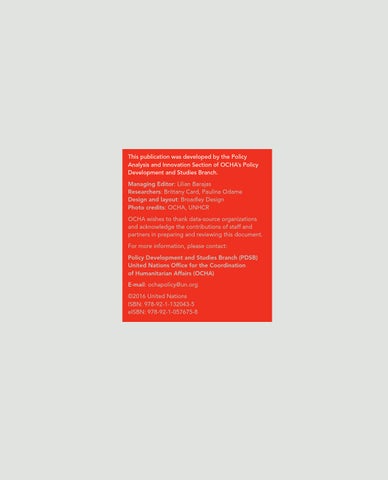 This publication was developed by the Policy Analysis and Innovation Section of OCHA’s Policy Development and Studies Branch. Managing Editor: Lilian Barajas Researchers: Brittany Card, Paulina Odame Design and layout: Broadley Design Photo credits: OCHA, UNHCR OCHA wishes to thank data-source organizations and acknowledge the contributions of staff and partners in preparing and reviewing this document. For more information, please contact: Policy Development and Studies Branch (PDSB) United Nations Office for the Coordination of Humanitarian Affairs (OCHA) E-mail: ochapolicy@un.org Š2016 United Nations ISBN: 978-92-1-132043-5 eISBN: 978-92-1-057675-8