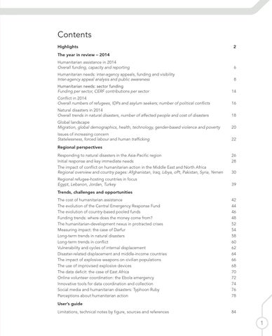 Trends, challenges and opportunities The cost of humanitarian assistance The evolution of the Central Emergency Response Fund The evolution of country-based pooled funds Funding trends: where does the money come from? The humanitarian-development nexus in protracted crises Measuring impact: the case of Darfur Long-term trends in natural disasters Long-term trends in conflict Vulnerability and cycles of internal displacement Disaster-related displacement and middle-income countries The impact of explosive weapons on civilian populations The use of improvised explosive devices The data deficit: the case of East Africa Online volunteer coordination: the Ebola emergency Innovative tools for data coordination and collection Social media and humanitarian disasters: Typhoon Ruby Perceptions about humanitarian action