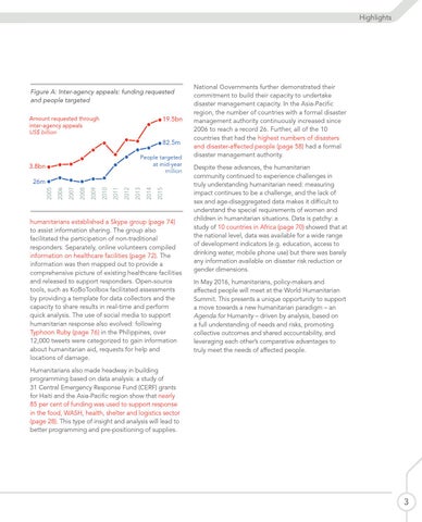 National Governments further demonstrated their commitment to build their capacity to undertake disaster management capacity. In the Asia-Pacific region, the number of countries with a formal disaster management authority continuously increased since 2006 to reach a record 26. Further, all of the 10 countries that had the highest numbers of disasters and disaster-affected people (page 58) had a formal disaster management authority. Despite these advances, the humanitarian community continued to experience challenges in truly understanding humanitarian need: measuring impact continues to be a challenge, and the lack of sex and age-disaggregated data makes it difficult to understand the special requirements of women and children in humanitarian situations. Data is patchy: a study of 10 countries in Africa (page 70) showed that at the national level, data was available for a wide range of development indicators (e.g. education, access to drinking water, mobile phone use) but there was barely any information available on disaster risk reduction or gender dimensions. In May 2016, humanitarians, policy-makers and affected people will meet at the World Humanitarian Summit. This presents a unique opportunity to support a move towards a new humanitarian paradigm – an Agenda for Humanity – driven by analysis, based on a full understanding of needs and risks, promoting collective outcomes and shared accountability, and leveraging each other’s comparative advantages to truly meet the needs of affected people.