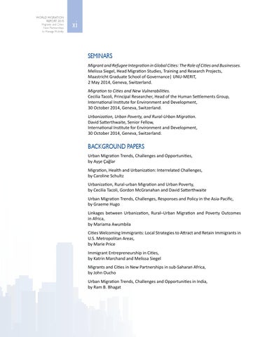 xi SEMINARS Migrant and Refugee Integration in Global Cities: The Role of Cities and Businesses. Melissa Siegel, Head Migration Studies, Training and Research Projects, Maastricht Graduate School of Governance| UNU-MERIT, 2 May 2014, Geneva, Switzerland. Migration to Cities and New Vulnerabilities. Cecilia Tacoli, Principal Researcher, Head of the Human Settlements Group, International Institute for Environment and Development, 30 October 2014, Geneva, Switzerland. Urbanization, Urban Poverty, and Rural-Urban Migration. David Satterthwaite, Senior Fellow, International Institute for Environment and Development, 30 October 2014, Geneva, Switzerland.