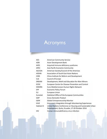 American Community Service Asian Development Bank Acquired immune deficiency syndrome Asia Pacific Economic Community American Society/Council of the Americas Association of South East Asian Nations China Institute for Reform and Development Council of Europe Development, Relief and Education for Alien Minors European Centre for Disease Prevention and Control Euro-Mediterranean Human Rights Network Economic Policy Forum European Union Statistical Office of the European Communities Gross Domestic Product Global Entrepreneurship Monitor Grassroots Integration through Volunteering Experiences United Nations Conference on Housing and Sustainable Urban Development, Quito, Ecuador, 17-20 October 2016 Human immunodeficiency virus infection