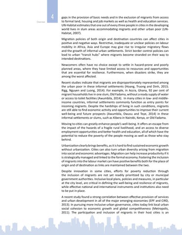 gaps in the provision of basic needs and in the exclusion of migrants from access to formal land, housing and job markets as well as health and education services. UN-Habitat estimates that one out of every three people in cities in the developing world lives in slum areas accommodating migrants and other urban poor (UNHabitat, 2007). Migration policies of both origin and destination countries can affect cities in positive and negative ways. Restrictive, inadequate or unclear policies on labour mobility in Africa, Asia and Europe may give rise to irregular migratory flows and the growth of informal urban settlements. Strict border control policies can lead to urban “transit hubs� where migrants become stranded on their way to intended destinations. Newcomers often have no choice except to settle in hazard-prone and poorly planned areas, where they have limited access to resources and opportunities that are essential for resilience. Furthermore, when disasters strike, they are among the worst affected. Recent studies indicate that migrants are disproportionately represented among the urban poor in these informal settlements (Hoang, Truong and Dinh, 2013; Rigg, Nguyen and Luong, 2014). For example, in Accra, Ghana, 92 per cent of migrant households live in one slum, Old Fadama, without a ready supply of water or access to toilet facilities (Awumbila, 2014). In many cities in low- and middleincome countries, informal settlements commonly function as entry points for incoming migrants. Despite the hardships of living in such conditions, migrants are still able to find economic activity and opportunities to improve their current well-being and future prospects (Awumbila, Owusu and Teye, 2014) in these informal settlements or slums, such as Kibera in Nairobi, Kenya, or Old Fadama. Moving to cities can greatly enhance people’s well-being. It offers an escape from the impact of the hazards of a fragile rural livelihood, and an access to diverse employment opportunities and better health and education, all of which have the potential to reduce the poverty of the people moving as well as those who stay behind. Urbanization clearly brings benefits, as it is hard to find sustained economic growth without urbanization. Cities can also turn urban diversity arising from migration into social and economic advantages. Migration can help increase productivity if it is strategically managed and linked to the formal economy. Fostering the inclusion of migrants into the labour market can have positive benefits both for the place of origin and of destination as links are maintained between the two. Despite innovation in some cities, efforts for poverty reduction through the inclusion of migrants are not yet readily prioritized by city or municipal government authorities. Inclusive local plans, policies and measures, in particular at the city level, are critical in defining the well-being and resilience of migrants, while effective national and international instruments and institutions also need to be put in place. A recent study found a strong correlation between effective provision of services and urban development in all of the major emerging economies (EPF and CIRD, 2013). In pursuing more inclusive urban governance, cities today link local urban social cohesion to economic growth and global competitiveness (Metropolis, 2011). The participation and inclusion of migrants in their host cities is an