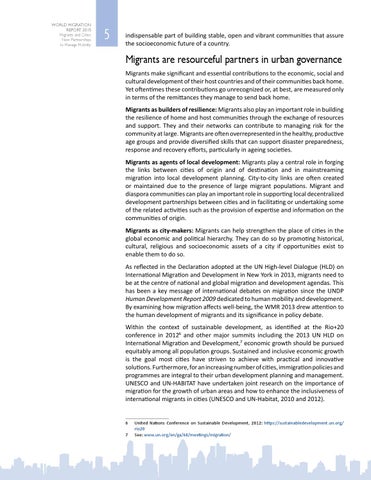Migrants are resourceful partners in urban governance Migrants make significant and essential contributions to the economic, social and cultural development of their host countries and of their communities back home. Yet oftentimes these contributions go unrecognized or, at best, are measured only in terms of the remittances they manage to send back home. Migrants as builders of resilience: Migrants also play an important role in building the resilience of home and host communities through the exchange of resources and support. They and their networks can contribute to managing risk for the community at large. Migrants are often overrepresented in the healthy, productive age groups and provide diversified skills that can support disaster preparedness, response and recovery efforts, particularly in ageing societies. Migrants as agents of local development: Migrants play a central role in forging the links between cities of origin and of destination and in mainstreaming migration into local development planning. City-to-city links are often created or maintained due to the presence of large migrant populations. Migrant and diaspora communities can play an important role in supporting local decentralized development partnerships between cities and in facilitating or undertaking some of the related activities such as the provision of expertise and information on the communities of origin. Migrants as city-makers: Migrants can help strengthen the place of cities in the global economic and political hierarchy. They can do so by promoting historical, cultural, religious and socioeconomic assets of a city if opportunities exist to enable them to do so. As reflected in the Declaration adopted at the UN High-level Dialogue (HLD) on International Migration and Development in New York in 2013, migrants need to be at the centre of national and global migration and development agendas. This has been a key message of international debates on migration since the UNDP Human Development Report 2009 dedicated to human mobility and development. By examining how migration affects well-being, the WMR 2013 drew attention to the human development of migrants and its significance in policy debate. Within the context of sustainable development, as identified at the Rio+20 conference in 20126 and other major summits including the 2013 UN HLD on International Migration and Development,7 economic growth should be pursued equitably among all population groups. Sustained and inclusive economic growth is the goal most cities have striven to achieve with practical and innovative solutions. Furthermore, for an increasing number of cities, immigration policies and programmes are integral to their urban development planning and management. UNESCO and UN-HABITAT have undertaken joint research on the importance of migration for the growth of urban areas and how to enhance the inclusiveness of international migrants in cities (UNESCO and UN-Habitat, 2010 and 2012). 6 7