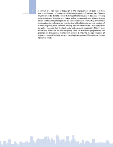 A critical area for such a discussion is the improvement of data collection practices. Chapter 1 of this report highlights the paucity of city-level data. There is much work to be done to ensure that migrants are included in data sets covering urbanization and development. Having a clear understanding of where migrants reside and how they are organized is a critical first step in formulating an outreach strategy in order to foster their inclusion in the life of cities. Based on a good set of data on migrants, cities can then develop benchmarks for basic service provision as well as measure their levels of social and economic integration. This, in turn, could help formulate an effective policy from the numerous programmes and practices on the ground. As shown in Chapter 1, knowing the age structure of migrant communities helps a city to identify growing areas of financial and human resources needs.