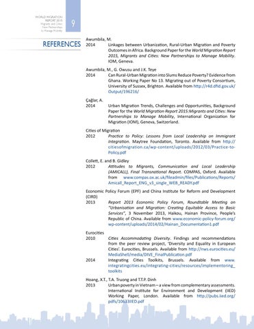 Awumbila, M. 2014 Linkages between Urbanization, Rural-Urban Migration and Poverty Outcomes in Africa. Background Paper for the World Migration Report 2015, Migrants and Cities: New Partnerships to Manage Mobility. IOM, Geneva. Awumbila, M., G. Owusu and J.K. Teye 2014 Can Rural-Urban Migration into Slums Reduce Poverty? Evidence from Ghana. Working Paper No 13. Migrating out of Poverty Consortium, University of Sussex, Brighton. Available from http://r4d.dfid.gov.uk/ Output/196216/ Çağlar, A. 2014