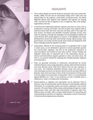 HIGHLIGHTS • Three million people around the world are moving to cities every week (UNHabitat, 2009). The fast rate of urbanization brings with it both risks and opportunities for the migrants, communities and governments. The World Migration Report 2015 explores how migration and migrants are shaping cities, and how the life of migrants in turn is shaped by cities, their people, organizations and rules. • It examines the relationships between migrants and cities on issues such as employment, housing and health, and also considers how migrants help to build and revive cities with their resources and ideas, both in the origin and host country. The Report also identifies innovative examples of how some cities are seeking to manage the challenges of increased global mobility and social diversity with varying degrees of success. It will highlight new policy developments concerning urban partnerships among migrant groups, local governments, civil society and the private sector which are designed to meet these challenges posed by migration and cities. • Urbanization, defined as the increasing share of a population that is living in urban areas, can be attributed in general to natural population growth, net rural-to-urban migration, and also to the progressive extensions of urban boundaries and creation of new urban centres. Human mobility and migration clearly play an important part in the urbanization process as internal and international migrants gravitate to cities and urban areas. Yet there is no common method for analysing the interplay between migration and urbanization. • Cities are generally conceived as settlements characterized by certain indicative features such as large populations, density, administrative functions and social diversity which make them distinct from non-city, suburban or rural areas. The traditional distinction between urban and rural areas in many developed countries has become blurred and the principal difference between urban and rural areas in terms of the circumstances of living, tends to be the degree of concentration of population. There is no internationally agreed definition of a “city” or any consensus on how to identify when a settlement is ‘urban’ or to determine its boundary. • Overall patterns in migration and urbanization can be observed. There is however a lack of empirical data and the absence of systematically collected information of a comparative quality and content, especially in low income countries. This lack of data inhibits a deep understanding of migrants in urban environments. Cities, with their high concentration of migrants, often from different places of origin, offer a unique spatial domain for researching and understanding the dynamics of migration, urbanization and the intersection of national and local governance and policy.